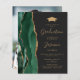 Este convite de festa de formatura de 2025 apresenta uma imagem de aquarela de um geode verde esmeralda de agate com realces falsos de brilho dourado. A palavra "Graduação" e o primeiro nome do formando aparecem num elegante guião dourado sobre fundo preto, juntamente com um boné de conselho de argamassa de cor dourada e detalhes da festa em fontes sans serif e itálico. Substitua facilmente a imagem de amostra na parte traseira por uma foto vertical do formando.