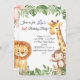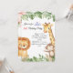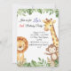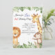 Convide seus convidados para uma celebração selvagem com este adorável convite para a selva! Apresentando um elefante fofo, girafa, leão e macaco cercado por uma exuberante vegetação, este convite é perfeito para aniversários, chás de fraldas, ou qualquer evento temático da selva.