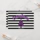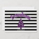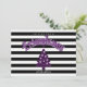 Um Convite de festas de Natal divertido com uma árvore de Natal roxa com crânios por todo o lado, listras pretas e brancas e um lugar para os detalhes da festa de amizade. Feliz Creepmas!
