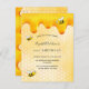 Elegante, divertida, aniversário de 21 anos de convite de festas de verão. Fundo amarelo, branco com um padrão de mel. Decorado com ouro, bebendo doce e abelhinhas felizes. O nome é escrito com um moderno estilo escrito à mão. Letras negras. Perfeito para uma festa de chá de verão em um jardim, quintal. Traseira: padrão amarelo de mel branco e uma abelha feliz. Dica: Se você não quiser que pareça um cartão postal, clique em personalizar, vá para o verso e remova o divisor e o carimbo de posto.