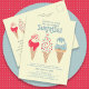Novo para o Verão de 2024. Nosso cartão-postal de convite "Sorvete, Gritar Que Todos Nós Gritares Surpresa!". Três cones retrorados de sorvete de aquarela com sorvete vermelho, branco e azul patriótico e aspersores ocupam o palco central acima de seus detalhes de festa de aniversário.