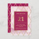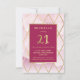 Este convite elegante e moderno de celebração de aniversário de 21 anos pode ser personalizado para sua ocasião especial. Apresenta uma estrutura dourada e linhas geométricas douradas no fundo, bem como uma lavagem do estilo de aquarela cor-de-rosa. Dentro do quadro dourado está uma caixa de fundo rosa-quente. "21" está em uma fonte de script de na moda. Um convite perfeito para o aniversário de uma jovem.