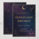 Convite para aniversário de 30 anos Celestial | Marinho e Douradas Estrelas Cósmicas Party Card brilham nos seus trinta anos com este sofisticado convite de aniversário celestial. Projetado com nuvens de aquarela marinho escuro, constelações de ouro e estrelas cintilantes, é ideal para festas elegantes de janto ou celebrações boho-quic. O modelo totalmente personalizável permite personalizar o nome, a idade, a data do evento, a hora e os detalhes de RSVP.