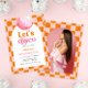 Este convite de aniversário apresenta um vibrante design com cores ousadas que captam perfeitamente o entusiasmo e o divertimento de uma celebração de aniversário de 30 anos. Ele apresenta uma estética inspirada por retrorreflectores com uma bola de disco e um padrão vibrante de verificação em quadrados alternados laranja e rosa. No fundo você pode adicionar uma legal foto da aniversariante para torná-la mais pessoal. Imagem mockup de freepik.