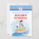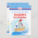 Convite para aniversário de 3 anos de crianças temáticas náuticas. Arte baleeira branca na frente e arte aquática de farol na parte inversa em azul, vermelho e branco. Personalize com os detalhes do seu próprio partido. Pinturas brancas originais e design por Sarah Trett.