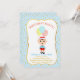 Cartão de aniversário de 3 anos de menino bonito. Um garotinho vestido de azul claro e vermelho está parado com três balões em branco e turquesa com fundo bolinhas de ouro.
