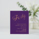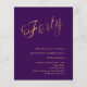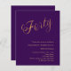 Um convite moderno e na moda para uma festa aniversário de 40 anos. Um fundo de cor púrpura e a palavra quarenta escrita com letras elegantes e grandes em dourado falso. Personalize e adicione um nome e detalhes da parte. 1 folha = 1 convite impresso de borda a borda.