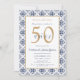 Todo o texto é editável, perfeito para um aniversário ou convite de casamento. Apresenta um padrão floral, com branco, preto e azul. Perfeito para qualquer evento clássico e elegante.