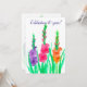 Um convite de festas de aniversário floral de casamento decorado com três flores vívidas gladióbulas em roxo, rosa e laranja com folhas verdes brilhantes pintadas com aquarela. Na Língua das Flores, Gladiolus significa "você pierga meu coração" e força do caráter. É também a tradicional flor do 40º aniversário.