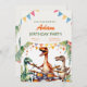 O convite de aniversário de uma criança temática de dinossauros é um desenho animado de um grupo de dinossauros celebrando o aniversário de uma criança. Design simples, cores brilhantes e um estilo amigável para crianças que você pode oferecer ao seu filho ou a um amigo.