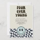 O convite de festas de 4 anos com o tema legal e divertido "Retrô", com estilos Legal de retrorreflectores com padrão verificado e rosto feliz O texto diz "FOURever Young". Perfeito para a festa de aniversário de um menino.
