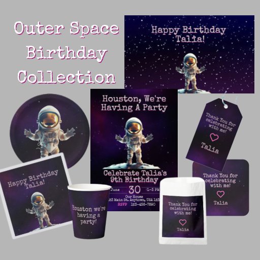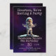 Convite de festas temático para o espaço exterior roxo e rosa. Excelente para uma festa de menina.