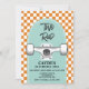 Skateboard Two Rad, convite de aniversário com cheque laranja e skate azul.