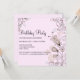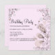 Este convite de aniversário moderno apresenta flores cor-de-rosa e azuis em fundo de rosa claro.