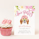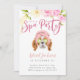 Cartão de convite de aniversário de criança bonito com uma ilustração adorável de um filhote de cachorro Charles King Spaniels com uma banda de cabeça de toalha e pepinos em seus olhos. Há flores cor-de-rosa e creme no topo. O texto diz "é uma festa spa". Perfeito para festas de dormir, maquiagem, manicura e pedicura de uma garota. Pampered!