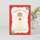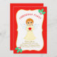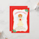 O convite para anjos da festa de Natal. Um pequeno anjo segurando um coração sobre fundo branco e vermelho. O texto está pronto para ser personalizado.
