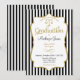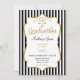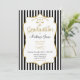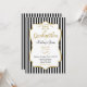 Um elegante convite para o anúncio de graduação da Faculdade de Direito preto e dourado com falso quadro de sotaque de ouro brilhante e listras negras e brancas com texto dourado e preto e escalas de justiça douradas. Este anúncio elegante de formatura na Faculdade de Direito é uma maneira fofa e divertida de convidar seus convidados para o seu grande dia.
