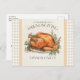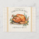 Reúna seus entes queridos com este charmoso convite postal de entrega de amizade. A design apresenta um peru lindamente torrado em uma planalta rodeada por ervas e bagas, enquadrado com uma borda macia de gingham bege em cada lado. Uma lavagem de aquarela amarelo-creme muda o fundo, enquanto o elegante roteiro lê, "Por favor, junte-se a nós para uma Festa Jante de Amizade." O verso inclui campos de texto personalizáveis para os detalhes do evento, fazer fácil de personalizar para a sua reunião. Perfeito para receber uma comemoração quente e festiva do outono.