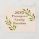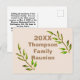 Crie um convite barato para sua próxima reunião familiar com esses cartões postais exclusivos. O ano e o nome da sua família aparecem no centro deste autocolante redondo. O texto está cercado por ramos de árvores com folhas verdes brilhantes. O fundo sólido castanho claro fornece a base para todo o design e pode ser personalizado. A parte traseira deste cartão postal de lançamento barato tem muito espaço para você adicionar suas informações de evento. Todo texto pode ser personalizado rápida e facilmente.