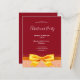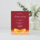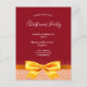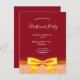Uma fita e um arco de cor dourada e grande, sobre um fundo vermelho elegante. Decorado com brilho rosa dourado e confete. Com o texto: Festa de Natal escrita com uma escrita de estilo moderna e moderna, com letras brancas de grande porte. Modelos para informações sobre a sua parte. Fundo: fundo vermelho. Dica: Se você não quiser que pareça um cartão postal, clique em personalizar, vá para o verso e remova o divisor e o carimbo de posto.