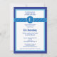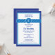 Este convite elegante mas moderno é ideal para celebrar um Bar Mitzvah com estilo e classe. Ele apresenta uma borda em diferentes tons de azul, uma faixa de faixas na placa e um círculo com o nome inicial. Adicione seu próprio texto e detalhes do evento.