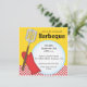 Este convite barbeque de cor brilhante apresenta um fundo dourado com uma faixa de cheques vermelhos na parte inferior. Uma luva vermelha e um gráfico de espátula estão no lado esquerdo com um grande círculo branco abrindo para o texto. Este convite pode ser personalizado para qualquer tipo de barbeque ou cookout.