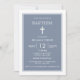 Convite para batismo personalizável, com uma borda branca limpa e fundo azul empoeirado, com uma cruz branca simples