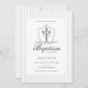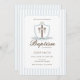 Este clássico design de convite batismo apresenta uma cruz cristã com uma crista blindada e listras azuis para um olhar eterno. Perfeito para o batizado do seu bebê ou cerimônia de batismo católico. Detalhes totalmente editáveis.