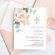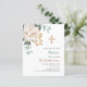 Uma flor branca, florais, verde de eucalipto e uma cruz de ouro. Personalize e adicione um nome e detalhes. 1 folha = 1 convite impresso de borda a borda.