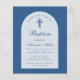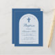 Um convite batismo para o batizado de um menino. Em um fundo azul clássico, ele tem um arco branco com dentro de texto azul empoeirado. A palavra Batismo e o nome são escritos num guião caligráfico elegante; a primeira linha é o texto arquivado.
