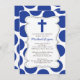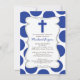 Um convite para o Batismo Sagrado, com uma cruz azul, num quadro na moda, num fundo de bolinhas azul popular. Sacudir nosso convite para o batismo moderno para encontrar uma polka azul e branca marinho escuro correspondente. Perfeito para um batismo ou batizar meninos contemporâneos. Disponível em nosso compro em uma variedade de cores para um bebê ou uma menina.