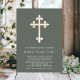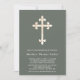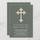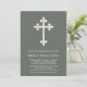 Convite de batismo personalizável com uma cruz de efeito ouro sobre um fundo verde da floresta.