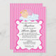 Comece a comemorar com este adorável convite para as meninas especiais Baptism/ Christening. Tem um fundo escuro e com rosas claro listradas. No topo está um bebê deitado numa nuvem com asas cor-de-rosa e um halo. Depois, há uma bolha rosa quente esboçada com um centro branco onde você pode personalizar com as informações do seu partido. Veja os muitos outros itens nesta linha, como etiquetas, postagens, notas de agradecimento e muito mais. ©JW ILlustrations