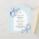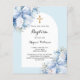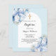 Um quadro de arco branco e fundo azul claro. Decorado com flores e arcos azuis e brancas. Uma cruz ouro. Personalize e adicione um nome e detalhes. 1 folha = 1 convite impresso de borda a borda.