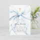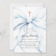 Mínimo convite para batismo que apresenta um elegante arco azul e uma cruz dourada.