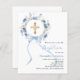 Um fundo branco elegante, decorado com flores azuis de cor aquosa em uma coroa, um arco azul e uma cruz ouro. Personalize e adicione um nome e detalhes. 1 folha = 1 convite impresso de borda a borda.