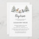 Este convite para o batismo de bebês, animais de floresta de inverno, é perfeito para um batismo de bebês de floresta ou batizar. O clássico design rústico apresenta uma cena do inverno com pinheiros e bebês da floresta. A caligrafia é uma cinza escura de cor, com uma tipografia simples contrastante, sobre um fundo branco básico. Personalize o convite com o nome do bebê e outros detalhes. QSD118
