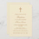 Convite para Batismo Elegante de Creme de Script bege, personalize conforme desejado, usando o modelo de personalização on-line antes de fazer o pedido. Este convite bonito apresenta tanto o texto cruzado como o na moda elegante em tom ouro de bege sobre fundo creme.