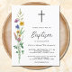 Este convite batismo orçamental é decorado com flores silvestres e uma cruz. Facilmente personalizável. Original Watercolor © Michele Davies.