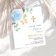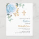 Uma floral azul clara, verde de eucalipto e uma cruz de ouro. Personalize e adicione um nome e detalhes. 1 folha = 1 convite impresso de borda a borda.