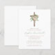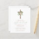 Este elegante convite batismo apresenta um buquê de cor d'água de rosas de marfim, folhagem de ouro rosa e verde de eucalipto numa simples cruz de madeira, acima das palavras "junte-se a nós para o batismo da nossa filha", em letras itálicas castanhas. Personalize-o com seu nome na caligrafia verde delicada da caligrafia, com os detalhes em fontes serif castanhas sobre fundo branco. Ideal para o batismo de uma garota.