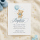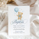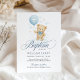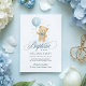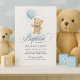 Celebre o batismo do seu bebê com este adorável convite com um ursinho de pelúcia segurando um balão de cruz. Com matizes azuis suaves, um roteiro elegante e um layout moderno, é perfeito para uma celebração espiritual e na moda. Totalmente editável e acessível a todas as famílias.