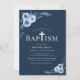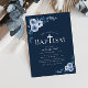 design floral azul e branco, batismo fotográfico personalizado e convite batizante. O texto e as cores podem ser editados.