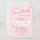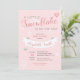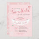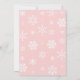Design apresenta o texto "Um pequeno floco de neve a caminho" junto com flocos de neve rosa e brancos sobre fundo rosa. O design é perfeito para um chá de fraldas de temas de inverno. O texto pode ser personalizável para ajustado das informações que você precisa colocar no cartão de convite.