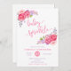 Um convite para bebês, 5 horas por dia, 7 dias por semana, com detalhes caligraficos adoráveis em tons de fúcsia e lavanda