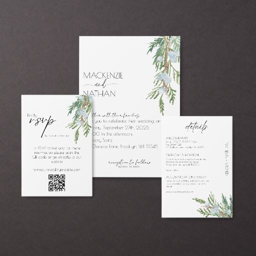 Coloque a cena para seu casamento no inverno com este convite à Berry de inverno. Azul macio, verduras congeladas, e delicados acentos de morango criam uma sensação nova e romântica — perfeita para sua celebração do tempo legal.