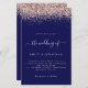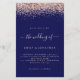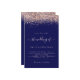 POR FAVOR, OBSERVE QUE HÁ UM convite por folha. Rosa de Orçamento Dourado de Marinho de Casamento Leve Convite. Um alternativo maior de 5,5" x 8,5" a um preço orçamentário. Disponível em um STOCK DE CARTÃO SEMI-GLOSS 110 lb ou em um STOCK DE CARTÃO INCORPORADO LINEN (ambos recomendados para convites), há também algumas opções de PAPEL MAIS FINO (que são ideais para gabinetes). NOTE QUE OS ENVELOPES FORNECIDOS SÃO UM POUCO MAIORES DO QUE O CONVITE DE 6,75" x 9". Uma borda de brilho dourado rosa está em cada lado, e O Casamento de em um script de escrita manual. O texto está em pincel suave sobre um fundo azul marinho. Personalize facilmente o texto para seus próprios detalhes. Você também pode alterar as cores do texto e do plano de fundo por meio da opção editar mais, se desejar.