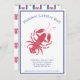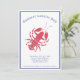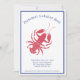 Convite para o tema vermelho, branco e lagosta azul. Grande lagosta vermelha na face e lagosta e padrão de listras azuis no verso.