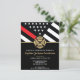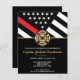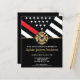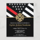 Este design apresenta uma bandeira de bombeiros com listras pretas e brancas, e uma fina faixa vermelha também. "Parabéns" e o crachá de bombeiros se senta acima de todos os detalhes da festa para o bombeiro aposentado, tenente ou festa de aposentadoria do chefe. Os convites também podem ser personalizados para um formando da academia de bombeiros.