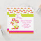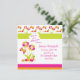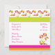 A borboleta, a almofada e as flores, todas em laranja, verde limão e rosa quente, formam esse convite para chás de fraldas criados em desenhos gráficos. A frente dá o nome da nova mãe e dá informações registradas e muito mais.